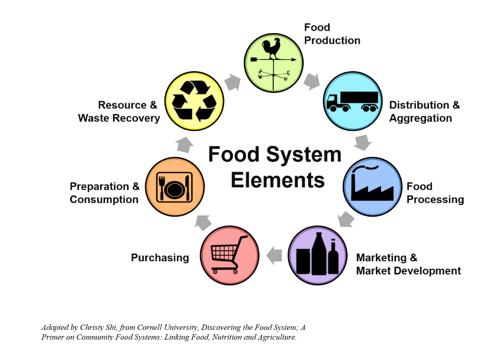When we talk about food systems, we are talking about the interconnected web of resources, activities, and processes that move food through the cycle of production, processing, distribution, retail, consumption, and disposal. Over the last several decades, we have seen a shift to a globalized food system that operates on a massive global scale and values efficiency above all else. While this change has helped expand our diets, it has also come at the expense of our environment, our health, our local economies and self-reliance. In contrast, local and regional food systems operate on a smaller geographic scale. They value sustainability, high quality food, living wages, safe working conditions, and reinvestment in the local economy. By keeping all elements of the food supply chain local, a strong local food system can even reduce costs for consumers, creating more equitable access to nourishing foods for all people.